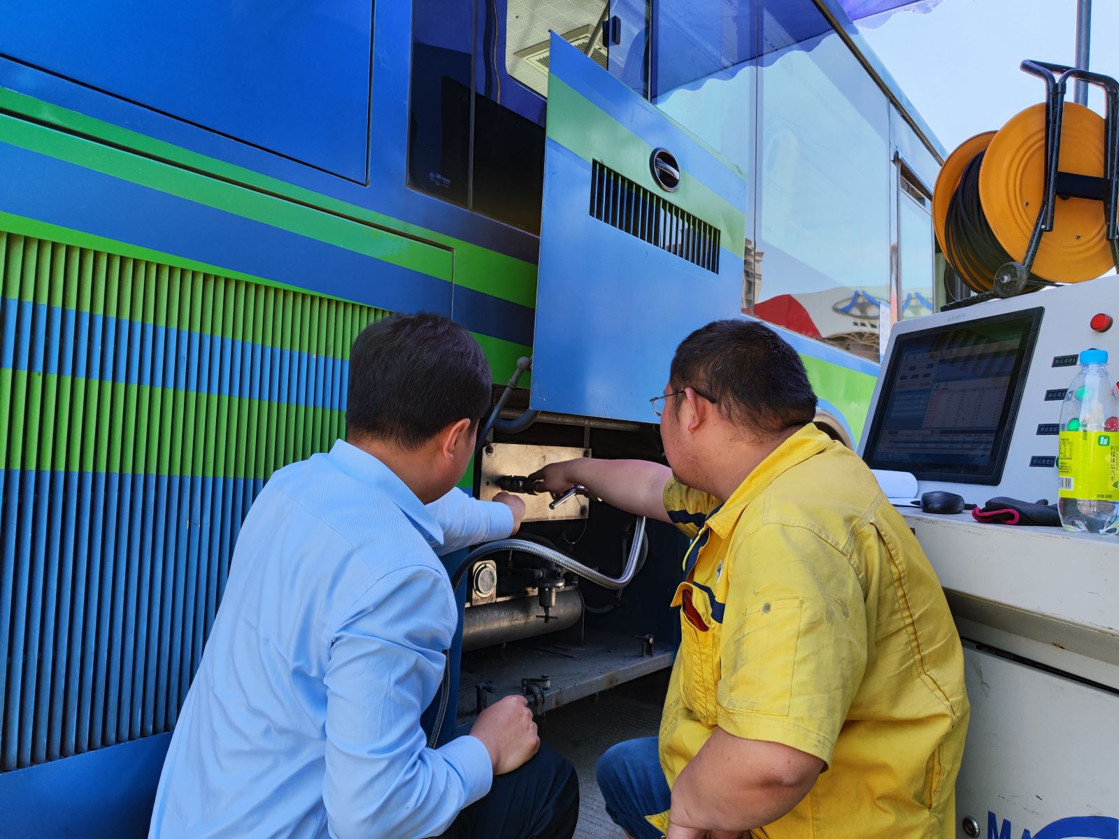 快速公交事業部現有LNG燃氣車輛96臺,車載LNG燃氣瓶檢查周期是兩年,本次檢測工作由連云港新奧燃氣公司承接開展,新奧燃氣公司根據車用氣瓶的特點及公交車輛使用的特殊性,制定了科學合理的檢驗標準流程,帶上專業設備上門服務,此次將檢測燃氣車輛96臺,重點對車輛氣瓶密閉安全性進行專項檢查。