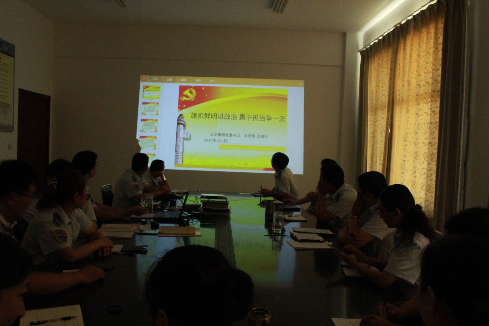7月14日上午,公交東部公司黨支部召開“旗幟鮮明講政治”專題學習,培訓會由支部副書記寧濘主持。此次培訓學習,寧濘帶領大家學習公交集團黨委書記、總經理劉佃華以《旗幟鮮明講政治 勇于擔當爭一流》為題的專題黨課,全面貫徹落實公交集團黨委的各項工作部署和要求。最后,寧濘要求:一是黨員、干部一定要旗幟鮮明講政治,時刻注意自己的黨員形象,要為廣大職工當表率。二是黨員、干部一定要敢擔當、有作為,深入一線,密切聯系群眾,切實解決一線駕駛員的實際困難。三是全體員工要加強自身學習,嚴格自律,干好本職工作,全力以赴做好當前創文工作。